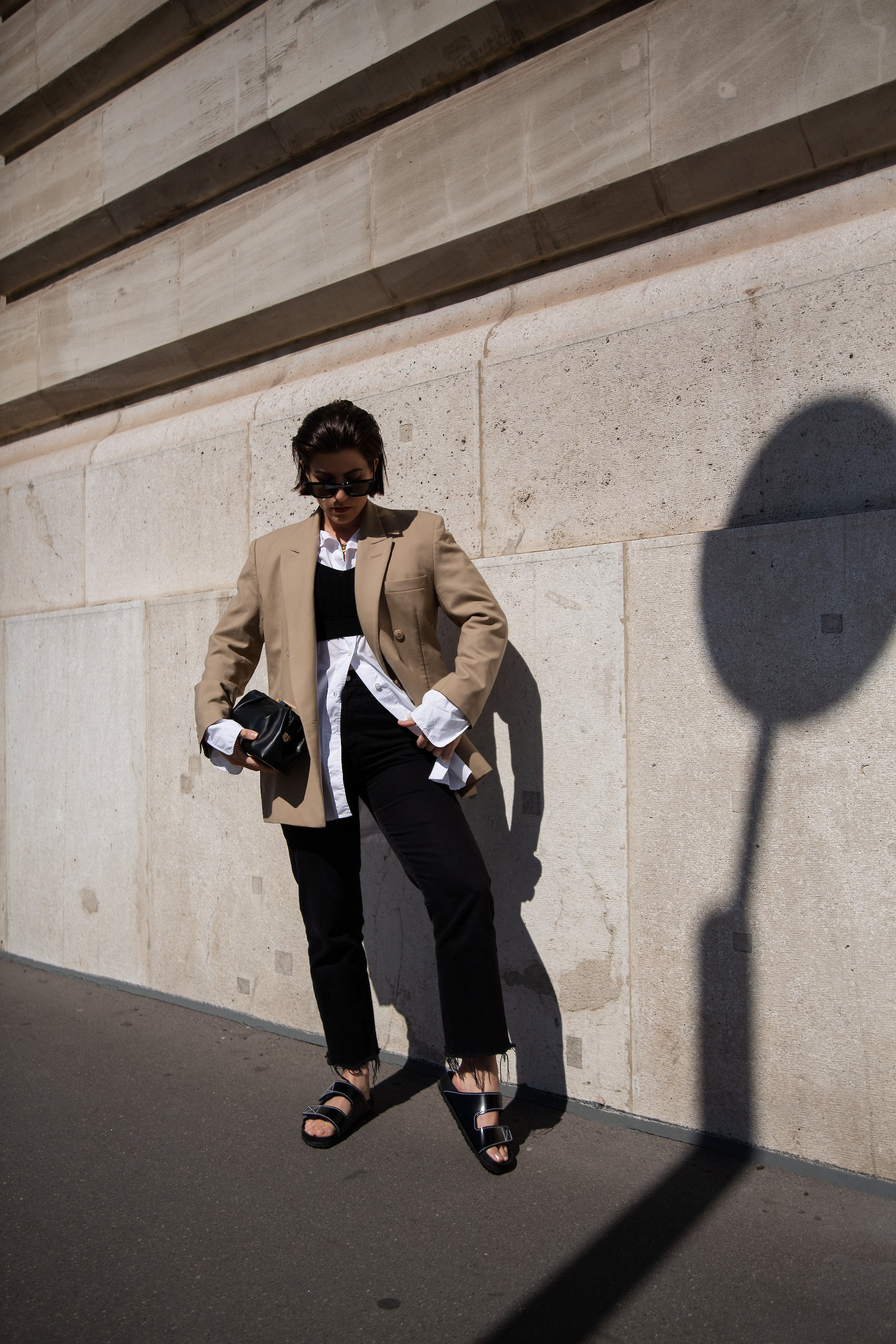 A loose cotton shirt underneath a Blazer that replaces a proper jacket. You can always get rid of the Blazer, in case of sudden temperature rise. And you can pull up the sleeves or unbutton the shirt. Whatever works best. To create more shape I chose to wear this gorgeous rib-knit number on top. I love the contrast it adds to the oversized shirt.